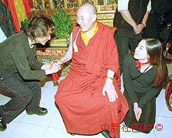 臺灣著名歌星齊秦(左)和王祖賢(右)十二日晚在北京拜望中國藏語系高級佛學院副院長那倉·向巴昂活佛。齊秦表示,他和王祖賢將在今年晚些時間在西藏拉薩舉行藏族式的婚禮。中新社記者 吳新華 攝