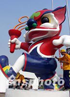 再過二十天,第九屆全國運動會將在廣州正式開幕。天河體育中心的工人正在為正門前的雕塑吉祥物威威上色。中新社圖 柯小軍 攝