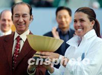 圖:“賭王”何鴻燊為卡佩雅蒂頒獎(jiǎng) 2002年01月07日 15:00 ![]() 排名女子網(wǎng)球世界單打第二的美國名將卡佩雅蒂,1月5日在香港女網(wǎng)挑戰(zhàn)賽決賽中獲得冠軍,“賭王”何鴻燊為其頒獎(jiǎng)。中新社傳真 任晨鳴 攝 |