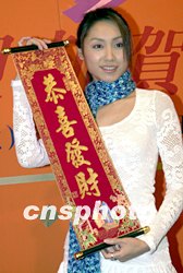 圖:郭可盈向觀眾拜年祝大家「恭喜發(fā)財(cái)」 2002年02月10日 09:09 ![]() 香港無(wú)線電視劇集《法網(wǎng)伊人》劇中眾藝員9日特為該劇舉行宣傳活動(dòng),藝員郭可盈向觀眾拜年祝大家“恭喜發(fā)財(cái)”。中新社傳真 鄧慶樂(lè) 攝