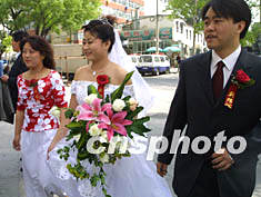 圖:北京另類新人“走婚”創(chuàng)紀(jì)錄 2002年05月07日 20:25 ![]() 五一假期,一對身穿禮服的新人舍棄豪華婚車,在家人陪同下從洋橋家中走到西單舉行婚禮,在假日婚潮中創(chuàng)造了一項(xiàng)“走婚”紀(jì)錄。中新社記者 鄭萍萍 攝