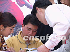 高空王子阿迪力平安著陸 下一沖擊目標(biāo)是長城(圖) 2002年05月11日 17:18 ![]() 十二日,剛剛在高空創(chuàng)下新吉尼斯紀(jì)錄的“高空王子”阿迪力來到北京春季書市,為記錄他挑戰(zhàn)世界記錄的《驚心22天》一書首發(fā)簽名義賣。義賣收入和“阿迪力基金”中的一萬元將捐給因患癌癥急需社會救助的21歲北京姑娘趙晶。中新社記者 章永哲 攝