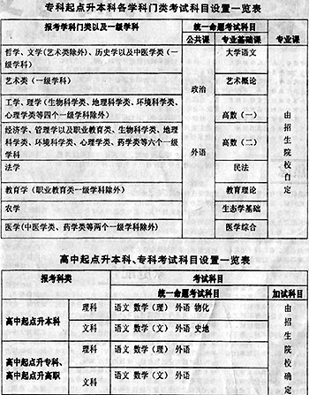 全國成人高考科目設(shè)置明年將作進(jìn)一步調(diào)整(附表) 2002年06月05日 16:09 ![]() 中新網(wǎng)北京6月5日消息:據(jù)中國教育報(bào)報(bào)道,為了使考試科目的設(shè)置更加適應(yīng)成人高等教育的特點(diǎn),更有利于提高成人高校招生的生源質(zhì)量和今后的培養(yǎng),有利于考試的組織和管理,從2003年起中國成人高校招生考試科目設(shè)置做進(jìn)一步的調(diào)整: 1.?破瘘c(diǎn)升本科統(tǒng)考科目按學(xué)科門類設(shè)置,不再按生源類別設(shè)置。統(tǒng)考科目為政治、外語和專業(yè)基礎(chǔ)課3門。專業(yè)基礎(chǔ)課根據(jù)各學(xué)科門類的特點(diǎn)設(shè)置8門(見專科起點(diǎn)升本科各學(xué)科門類考試科目設(shè)置一覽表),由招生院校按專業(yè)的需要規(guī)定考生應(yīng)試其中一門。 2.高中起點(diǎn)升專科(含高職)、高中起點(diǎn)升本科考試按文科、理科分別設(shè)置統(tǒng)考科目。其中,高中起點(diǎn)升?(含高職)統(tǒng)考科目為語文、數(shù)學(xué)(分文科類、理科類兩種,下同)、外語3門,主要考查考生是否具備接受高等?茖哟谓逃淖罨疽蟆?紤]到本科教育與?平逃囵B(yǎng)目標(biāo)和教學(xué)要求的不同,報(bào)考高中起點(diǎn)升本科的統(tǒng)考科目的理科類考生增加一門“物理化學(xué)綜合課”(簡稱物化),文科類考生增加一門“歷史地理綜合課”(簡稱史地)(見高中起點(diǎn)升本科、專科考試科目設(shè)置一覽表)。 3.各類考生除參加上述規(guī)定的統(tǒng)考科目考試外,招生院?筛鶕(jù)專業(yè)要求自行確定是否再加試一門考試科目。如需加試,招生院校必須在招生簡章中注明并自行命題和組織考試,于錄取工作開始前,向有關(guān)省級(jí)成人高校招生辦公室提交加試合格考生名單。錄取時(shí),省級(jí)成人高校招生辦公室根據(jù)加試合格考生名單向招生院校投檔,招生院校根據(jù)考生參加統(tǒng)考的成績,由高分到低分擇優(yōu)錄取(藝術(shù)類和體育類專業(yè)在考生文化課符合要求的基礎(chǔ)上,按加試專業(yè)課成績從高分到低分錄取)。不需加試的院校,按考生參加統(tǒng)考科目的成績錄取。 4.統(tǒng)考科目除?粕究瓶荚嚨拿穹ㄔ囶}由司法部命制外,其他試題均由教育部統(tǒng)一命制。各門試題滿分為150分;高中起點(diǎn)升本科、?频慕y(tǒng)考科目每門考試時(shí)間為120分鐘,?粕究泼块T考試時(shí)間為150分鐘。