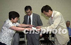 ![]() 花岡事件受難者聯(lián)誼會(huì)2日在日本國(guó)會(huì)發(fā)表《致日本內(nèi)閣函》,要求日本政府正視強(qiáng)擄、奴役中國(guó)戰(zhàn)俘勞工的歷史,承擔(dān)政治、法律、道義上的責(zé)任,公開、正式地向中國(guó)人民謝罪。圖為受難者家屬代表王紅向日本國(guó)會(huì)議員提交函件。中新社記者 陶光雄 攝