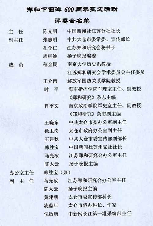 “鄭和下西洋600周年”征文啟示 2002年07月05日 10:36 ![]() 鄭和下西洋600周年征文活動評委會名單 為紀(jì)念鄭和下西洋600周年,弘揚(yáng)鄭和開放和探險精神,進(jìn)一步提升鄭和七下西洋起錨地太倉的知名度,促進(jìn)太倉的兩個文明建設(shè)和經(jīng)濟(jì)發(fā)展,特舉行征文活動。 一、征文時間 從2002年7月11日起(鄭和下西洋紀(jì)念日)至2003年7月11日止。 二、征文內(nèi)容 圍繞鄭和七下西洋起錨地太倉與鄭和,從歷史與現(xiàn)實(shí)的結(jié)合上,從跨越600年的時間和空間中,從不同視角充分展示鄭和精神及給太倉歷史、經(jīng)濟(jì)、文化等方面帶來的影響。 三、征文形式 1、學(xué)術(shù)論文類; 2、文學(xué)類,包括小說、散文、隨筆、詩歌、故事、盈聯(lián)等; 3、新聞類,包括消息、通訊、特寫、專訪、述評等。 四、征文字?jǐn)?shù) 論文一般不超過5000字;文學(xué)作品一般不超過3000字(長、中篇小說例外);新聞一般不超過1500字。 五、征文刊用 征文作品在中新江蘇網(wǎng)、中新網(wǎng)長江第一港、揚(yáng)子晚報“聚焦蘇錫!睂0、《鄭和研究》雜志刊用。 六、征文評比 征文頒獎活動在2003年9月份舉行,評出論文類、文學(xué)類、新聞類一等獎各一名,獎金3000元;二等獎各三名,獎金1500元;三等獎各五名,獎金500元,另評出榮譽(yù)獎若干名。 七、征文請寄江蘇省太倉市體育東路58號,中新網(wǎng)長江第一港編輯部,郵編215400。另電子文檔以word形式保存,寄jiangzhenjiang@chinanews.com.cn作者請自留底稿,所有應(yīng)征作品一律不退稿。 八、本次征文活動解釋權(quán)在征文活動組委會。 主辦單位:太倉市委、市人民政府 中國新聞社江蘇分社 揚(yáng)子晚報“聚焦蘇錫!本庉嫴 江蘇鄭和研究會 二OO二年七月一日