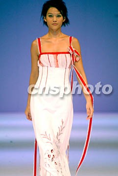 圖:香港設(shè)計師鄭兆良的“仿旗袍天女下凡裝” 2002年07月12日 10:09 ![]() “2003香港春夏時裝節(jié)”7月10日晚舉行香港十位頂尖設(shè)計師作品展示,模特展示著名設(shè)計師鄭兆良設(shè)計的一款仿旗袍低胸配紅長飄帶女裙,恍如天女下凡。任晨鳴 攝