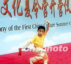 圖:天津霍元甲武術(shù)學(xué)校小朋友表演武術(shù) 2002年07月30日 14:47 ![]() 由中國對外文化交流協(xié)會主辦的首屆中國文化夏令營,七月二十九日在天津華夏未來少兒藝術(shù)中心開營。天津霍元甲武術(shù)學(xué)校的小朋友在開營儀式上表演武術(shù)。作者:孫志民