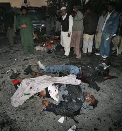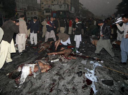 中新網12月27日電 據路透社報道,巴基斯坦前總理貝-布托今日在競選集會上遭到炸彈襲擊,不治身亡。圖為爆炸現(xiàn)場。(關新)