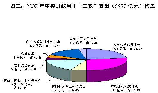 (二)大力支持解決“三農(nóng)”問(wèn)題,促進(jìn)城鄉(xiāng)協(xié)調(diào)發(fā)展。2005年財(cái)政支持“三農(nóng)”繼續(xù)保持了力度大、政策實(shí)、措施強(qiáng)的特點(diǎn)。全年僅中央財(cái)政用于“三農(nóng)”的支出就達(dá)2975億元,比2004年實(shí)際執(zhí)行數(shù)增加349億元,增長(zhǎng)13.3%。一是不斷深化農(nóng)村稅費(fèi)改革。中央財(cái)政為此轉(zhuǎn)移支付662億元,比2004年增長(zhǎng)26.3%。2005年,牧業(yè)稅和除煙葉外的農(nóng)業(yè)特產(chǎn)稅已全部免征;免征農(nóng)業(yè)稅的省份達(dá)到28個(gè),8億農(nóng)民受益。二是認(rèn)真落實(shí)“三補(bǔ)貼”等政策。全國(guó)30個(gè)省份用于糧食直補(bǔ)的資金達(dá)到132億元,比2004年增長(zhǎng)13.8%。兌付良種補(bǔ)貼資金38.7億元,比2004年增長(zhǎng)35.8%。中央財(cái)政兌付農(nóng)機(jī)具購(gòu)置補(bǔ)貼資金3億元,是2004年的4倍多。另外,落實(shí)專項(xiàng)資金55億元,對(duì)產(chǎn)糧大縣予以財(cái)力補(bǔ)助;對(duì)企業(yè)生產(chǎn)銷(xiāo)售的尿素免征增值稅,運(yùn)用關(guān)稅政策鼓勵(lì)進(jìn)口國(guó)內(nèi)短缺的農(nóng)業(yè)生產(chǎn)資料。調(diào)動(dòng)了地方政府重農(nóng)抓糧的積極性,維護(hù)了糧食安全。三是支持農(nóng)業(yè)和農(nóng)民長(zhǎng)遠(yuǎn)發(fā)展。2005年中央財(cái)政用于農(nóng)業(yè)農(nóng)村基礎(chǔ)設(shè)施建設(shè)的預(yù)算內(nèi)基本建設(shè)投資和國(guó)債項(xiàng)目資金達(dá)812.78億元,進(jìn)一步改善了農(nóng)村生產(chǎn)生活條件。中央財(cái)政用于農(nóng)業(yè)綜合開(kāi)發(fā)資金98.55億元,新增資金中76.6%用于糧食主產(chǎn)區(qū)中低產(chǎn)田改造的農(nóng)業(yè)基礎(chǔ)設(shè)施建設(shè)。同時(shí),積極探索采用投資參股、專項(xiàng)貼息等形式,更加有效地發(fā)揮農(nóng)業(yè)綜合開(kāi)發(fā)資金的引導(dǎo)、示范和帶動(dòng)效應(yīng)。中央財(cái)政支持280萬(wàn)農(nóng)村勞動(dòng)力轉(zhuǎn)移培訓(xùn),補(bǔ)助資金4億元,比2004年增長(zhǎng)60%。不斷增加用于扶貧開(kāi)發(fā)方面的投入,2005年達(dá)到130億元。中央財(cái)政安排資金251.7億元,直接補(bǔ)貼退耕還林的農(nóng)民。繼續(xù)大力支持農(nóng)業(yè)科技推廣、農(nóng)業(yè)產(chǎn)業(yè)化、農(nóng)民專業(yè)合作組織發(fā)展、小型農(nóng)田水利建設(shè)和測(cè)土配方施肥等。