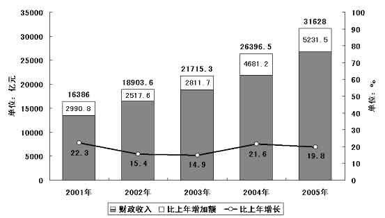 圖表二 “十五”期間全國(guó)財(cái)政收入及其增長(zhǎng)情況