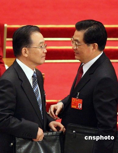 圖:胡錦濤、溫家寶在人大會(huì)上交談