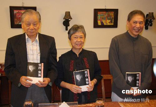 九月三十日下午,女作家陳若曦(中)在臺北舉辦新著《堅持·無悔——陳若曦七十自述》出版發(fā)布會。著名作家白先勇(右)前來向當年臺大老同學(xué)祝賀。陳若曦一九三八年生于臺北縣中和,臺大外文系畢業(yè)后留學(xué)美國,獲約翰霍普金斯大學(xué)寫作系碩士。一九六六年與丈夫回到中國大陸,一九七三年到香港居住,先后移居加拿大、美國,近年定居臺北。其作品曾被譯為英、德、日、法、挪威等文字。中新社發(fā) 耿軍 攝