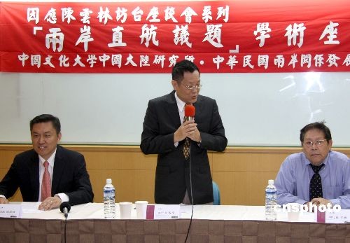 “因應(yīng)陳云林訪臺座談會系列——兩岸直航議題學(xué)術(shù)座談會”十七日在臺北舉辦。中國文化大學(xué)中國大陸研究所所長邵宗海教授(中立者)邀請“立委”帥化民(右)、前澳門航空公司總經(jīng)理費鴻鈞(左)做演講。中新社發(fā) 耿軍 攝