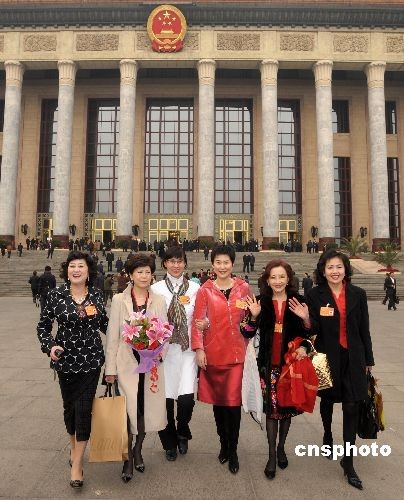 三月八日,國際勞動(dòng)?jì)D女節(jié),全國政協(xié)女委員參加完大會(huì)笑容燦爛走出北京人民大會(huì)堂。中新社發(fā) 廖攀 攝