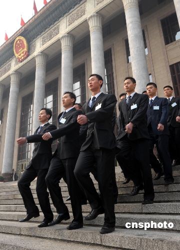 三月八日,全國(guó)政協(xié)十一屆一次會(huì)議第二次全體會(huì)議在北京人民大會(huì)堂舉行。會(huì)議結(jié)束后,身穿深色西服的工作人員整齊列隊(duì)走下大會(huì)堂的高臺(tái)階。中新社發(fā) 廖攀 攝