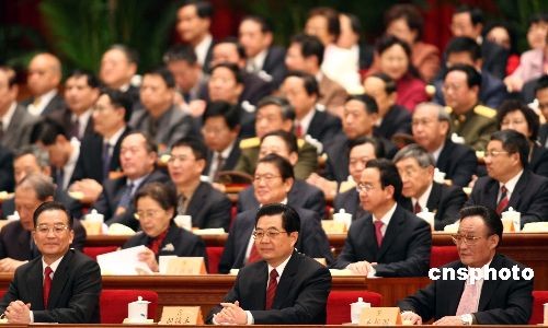 3月14日上午,全國政協(xié)十一屆一次會議在北京人民大會堂閉幕,胡錦濤、吳邦國(前排右)、溫家寶(前排左)出席。中新社發(fā) 盛佳鵬 攝