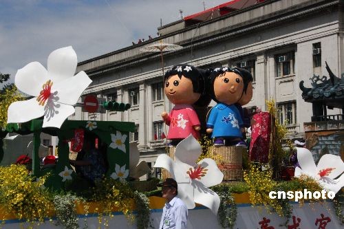 十日上午,一些推廣本地經(jīng)濟(jì)、文化特色的花車,駛過臺北市區(qū)。圖中這輛由臺灣“客委會”布置的花車在宣傳如何弘揚(yáng)客家文化。中新社發(fā) 耿軍 攝