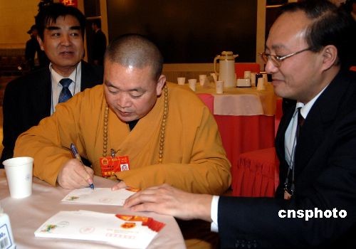 全國(guó)兩會(huì)召開期間,全國(guó)人大代表、少林寺方丈釋永信成為會(huì)上引人注目的明星,經(jīng)常有媒體采訪和代表委員求簽名。圖為他在給代表簽名兩會(huì)紀(jì)念郵票首日封。中新社發(fā) 王東明 攝