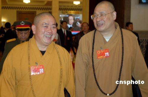 3月10日上午,十一屆全國人大一次會議在北京人民大會堂舉行第三次全體會議,中國佛教協會副會長、河南省佛教協會會長、河南省少林寺方丈釋永信(左),中國佛教協會常務副會長、湖南省佛教協會會長釋圣輝共同出席。中新社發(fā) 劉萬強 攝