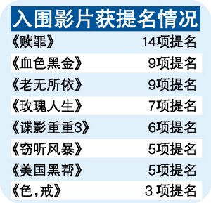 被喻為“英國(guó)奧斯卡”的2008年英國(guó)影視藝術(shù)文化學(xué)院頒獎(jiǎng)禮(BAFTA),前日公布提名名單,《色,戒》報(bào)名角逐最佳電影、導(dǎo)演及女主角等11個(gè)項(xiàng)目,結(jié)果除了較早前公布入圍最佳新人(湯唯)和外語(yǔ)片之外,只有最佳服裝設(shè)計(jì)(樸若木)能獲提名;而凱拉·奈特利主演的《贖罪》,則獲得本屆最多14項(xiàng)提名,成為大熱之選。