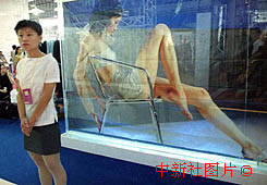 在中國各地舉辦的服裝服飾展示會上,越來越多的服裝廠家采用各種新穎的形式進行商業(yè)促銷。圖為江蘇服裝博覽會現(xiàn)場,一廠商用真模特做廣告宣傳內(nèi)衣。中新社記者 錢興強 攝