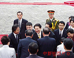 日本首相森喜朗今天在日本東京迎賓館舉行隆重的歡迎儀式,歡迎中國總理朱镕基總理訪日。圖為朱镕基在森喜朗首相陪同下檢閱儀仗隊(duì)后與出席歡迎儀式的日方官員握手。中新社記者:王曉暉