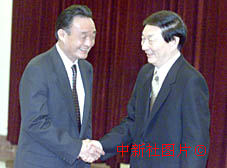 中國(guó)國(guó)務(wù)院總理朱镕基訪問日本、韓國(guó)后,22日乘專機(jī)回到北京,國(guó)務(wù)院副總理吳邦國(guó)等在北京人民大會(huì)堂迎接。中新社記者 毛建軍 攝