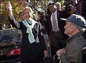 圖文:美國第一夫人希拉里當(dāng)選紐約州參議員 2000年11月8日 10:49 希拉里成為紐約州的參議員。 中新網(wǎng)北京11月8日消息:美國第一夫人希拉里,成功擊敗對手拉齊奧,為民主黨在紐約州奪得一個(gè)參議員席位,從而她踏上政治舞臺邁進(jìn)了一大步。 綜合外電報(bào)道希拉里是美國歷史上首位從政的第一夫人。為了這次選舉,西拉里專程從華盛頓搬到紐約州居住。美國總統(tǒng)克林頓在選舉前表示,會全力支持希拉里參政。 |