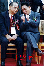 二十日,出席在福建龍巖舉辦的世界客屬第十六屆懇親大會開幕式的國務院僑辦主任郭東坡(右一)與香港知名人士曾憲梓親切交談。中新社記者 劉可耕 攝