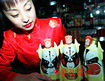 北京老舍茶館的服務(wù)小姐正在向戲迷推銷一種包裝獨(dú)特的“戲酒”。這種繪有京劇臉譜的瓶裝酒,在元旦節(jié)前一上市就受到戲迷們的青睞。中新社記者 張勤 攝