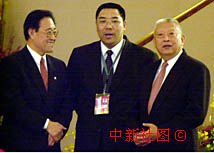 圖片:董建華與宗光耀、長崔世安一起交談 2000年12月19日 21:33 ![]() 中華人民共和國澳門特別行政區(qū)成立一周年慶祝晚宴十九日在澳門綜藝館舉行,香港特區(qū)行政長官董建華(右一)在宴會上與澳門中聯(lián)辦副主任宗光耀、澳門特區(qū)社會文化司司長崔世安(中)一起交談。中新社傳真 宗金柱 攝