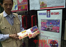 圖文:澳門郵政局20日發(fā)行澳門特區(qū)成立一周年紀(jì)念郵票 2000年12月20日 13:51 ![]() 澳門郵政局20日發(fā)行澳門特區(qū)成立一周年紀(jì)念郵票,專門從香港乘早班船到澳門訂購郵票的朱炳然先生高興的展示排隊選購到的紀(jì)念郵票。中新社傳真洪少葵攝