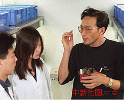 全國人大代表,北京大學(xué)副校長陳章良教授(右一)十三日在實驗室與科研人員開展人類第一次破譯全部DNA密碼的高等植物擬南芥的研究。作者:陳勇