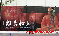 中國唐代高僧鑒真東渡日本,帶來大量中國先進文化,成為中日友好交流的象征。時隔一千多年,鑒真至今仍深受日本人民尊敬,東京美術(shù)館今春舉辦為期兩個月的“鑒真和尚展”。圖為兩名工作人員在東京鬧市區(qū)涉谷描繪巨幅展覽廣告畫。中新社圖 陶光雄 攝