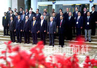 中國(guó)國(guó)家主席江澤民二十六日在海南博鰲水城集體會(huì)見(jiàn)出席亞洲論壇的貴賓,并在鮮艷的紅花叢前,與這些亞洲國(guó)家的前政要們和論壇秘書長(zhǎng)合影。中新社記者 賈國(guó)榮 攝