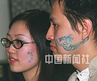 臉上繪有各種圖案的年輕人日前參加北京一間家具店的開(kāi)業(yè)派對(duì),“體繪”如今已成為年輕人的一種時(shí)髦。中新社圖 史利 攝
