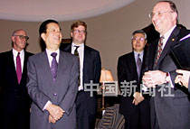 國務(wù)院副總理錢其琛當(dāng)?shù)貢r(shí)間十九日會見美國工商界人士時(shí)說,他明日將與美國主流媒體負(fù)責(zé)人共進(jìn)早餐。美國大公司的老板們對錢其琛開玩笑說:“那他們肯定會提很多問題難為你的!辟e主聽后大笑。中新社圖 陳建 攝