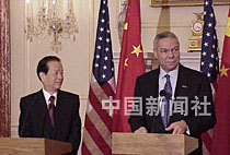 美東時(shí)間二十一日晚,中國(guó)國(guó)務(wù)院副總理錢其琛與美國(guó)國(guó)務(wù)卿鮑威爾,在美國(guó)國(guó)務(wù)院大樓舉行會(huì)談前會(huì)見記者,雙方希望繼續(xù)推進(jìn)中美兩國(guó)關(guān)系向前發(fā)展。中新社圖 京華 攝