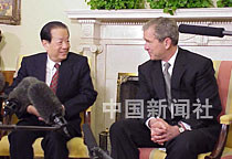 美國(guó)總統(tǒng)布什二十二日在白宮會(huì)見(jiàn)中國(guó)國(guó)務(wù)院副總理錢(qián)其琛時(shí)說(shuō),他期待著今年秋天到中國(guó)訪問(wèn)。中新社圖 京華 攝