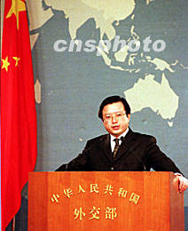 中國外交部發(fā)言人朱邦造四月三日在北京的記者招待會上,談到美國偵察機一日撞毀中國軍用飛機事件時說,中國海軍正在全力搜救我方落海飛行員。中新社記者 鄒憲 攝