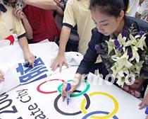 廣州中山大學(xué)、暨南大學(xué)等十所高校十八日在中山大學(xué)聯(lián)合舉行“華南萬名師生支持北京申奧巡回簽名活動(dòng)首簽式,中國(guó)奧運(yùn)冠軍劉璇在場(chǎng)簽名。中新社記者 羅仰明 攝