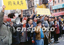紐約華人社團聯(lián)合會等僑團二十一日在華埠鬧市的六個地段向行人講解“法輪功”的危害。聯(lián)合總會主席梁冠軍(左四)用麥克風(fēng)向“法輪功”信徒呼吁珍惜自己和家人的生命,不要再受李宏志的蒙騙。中新社圖 郭健 攝