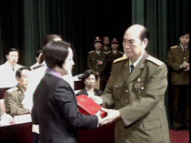 中央軍委二十四日在北京隆重舉行授予王偉“?招l(wèi)士”榮譽(yù)稱號命名大會,張萬年向王偉烈士的妻子阮國琴頒發(fā)授予王偉的一級英模獎(jiǎng)?wù)潞蜆s譽(yù)證書。