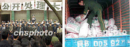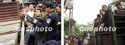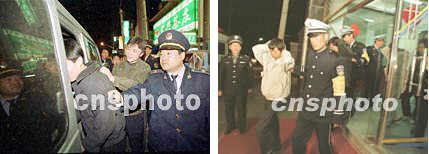 新聞組圖:中國各地嚴打行動 2001年4月25日 10:04 ![]() 圖(1) 圖(2) ![]() 圖(3) 圖(4) ![]() 圖(5) 圖(6) 圖(1)說明:北京西城公安分局、工商局日前聯(lián)合在夜間清理音像市場,當場抓獲販賣盜版光盤人員十余名。中新社記者宋吉河攝 圖(2)說明:北京公安西城公安分局日前夜間收容外地進京“三無”人員,全面整頓社會治安。中新社記者宋吉河攝 圖(3)說明:重慶市巴南區(qū)二十四日在電影院廣場前公開審判十九名刑事犯罪分子,上千名當?shù)厝罕妳⒓恿舜髸,無不拍手稱快。中新社記者趙振清攝 圖(4)說明:福清市公安邊防大隊官兵,23日凌晨在“治爆緝槍專項行動”中,先后破獲二起特大偷運、私藏炸藥案,共查獲土制銨油炸藥5000多公斤、雷管283枚、導火索250米。圖為一名邊防警員在福清?阪(zhèn)方新村官下尾路段攔檢一輛裝載有土制銨油炸藥的可疑貨車。中新社圖賀錕陳暉攝 圖(5)說明:中國重慶市巴南區(qū)二十四日在該區(qū)電影院廣場前公開審判十九名刑事犯罪分子,當?shù)厣锨忻駠^犯罪分子被押上刑車,送往監(jiān)獄的過程。中新社記者趙振清攝 圖(6)說明:中國重慶市巴南區(qū)二十四日在該區(qū)影院廣場公開審判十九名刑事犯罪分子,當?shù)厍忻瘳F(xiàn)場目睹犯罪分子被押上刑車,送往監(jiān)獄的過程。中新社記者趙振清攝 |