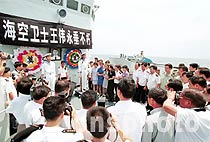 ![]() 509號(hào)導(dǎo)彈護(hù)衛(wèi)艦官兵脫帽肅立,為英雄王偉送行。 張全躍 攝 ![]() 王偉妻子阮國(guó)琴(中)、姐姐王琳(左三)在海軍509號(hào)導(dǎo)彈護(hù)衛(wèi)艦甲板上為王偉默哀。中新社圖 張全躍 攝
