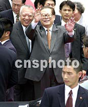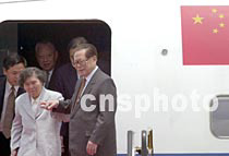 ![]() 中國(guó)國(guó)家主席江澤民5月8日中午乘專機(jī)抵達(dá)香港機(jī)場(chǎng),參加“2001年《財(cái)富》全球論壇”,登車前向采訪的記者招手致意。中新社傳真任晨鳴攝