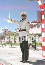 西藏首府拉薩市的第一支女子交通警察隊,十五日正式上崗,隊長索朗德吉在布達拉宮前的崗臺指揮交通。這支女子交警隊的七名隊員中有六名是藏族。中新社圖 王魯平 攝