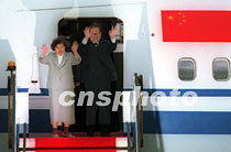 國(guó)家主席江澤民9日結(jié)束訪問香港,江澤民主席與夫人王冶坪向送行人士揮手道別。中新社傳真 盧峰 攝