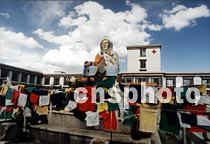 拉薩藏醫(yī)院前高豎先師玉妥·云登貢布的塑像。中新社記者 賈國榮 攝