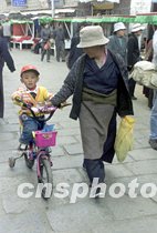 西藏拉薩的一位藏族小朋友騎著小自行車上街,與母親傳統(tǒng)的藏裝相比,他的裝備無疑是現(xiàn)代了許多。中新社記者 滿會(huì)喬 攝